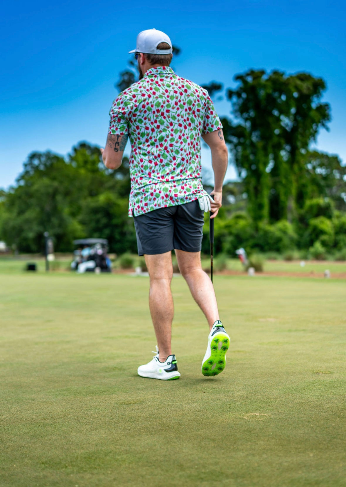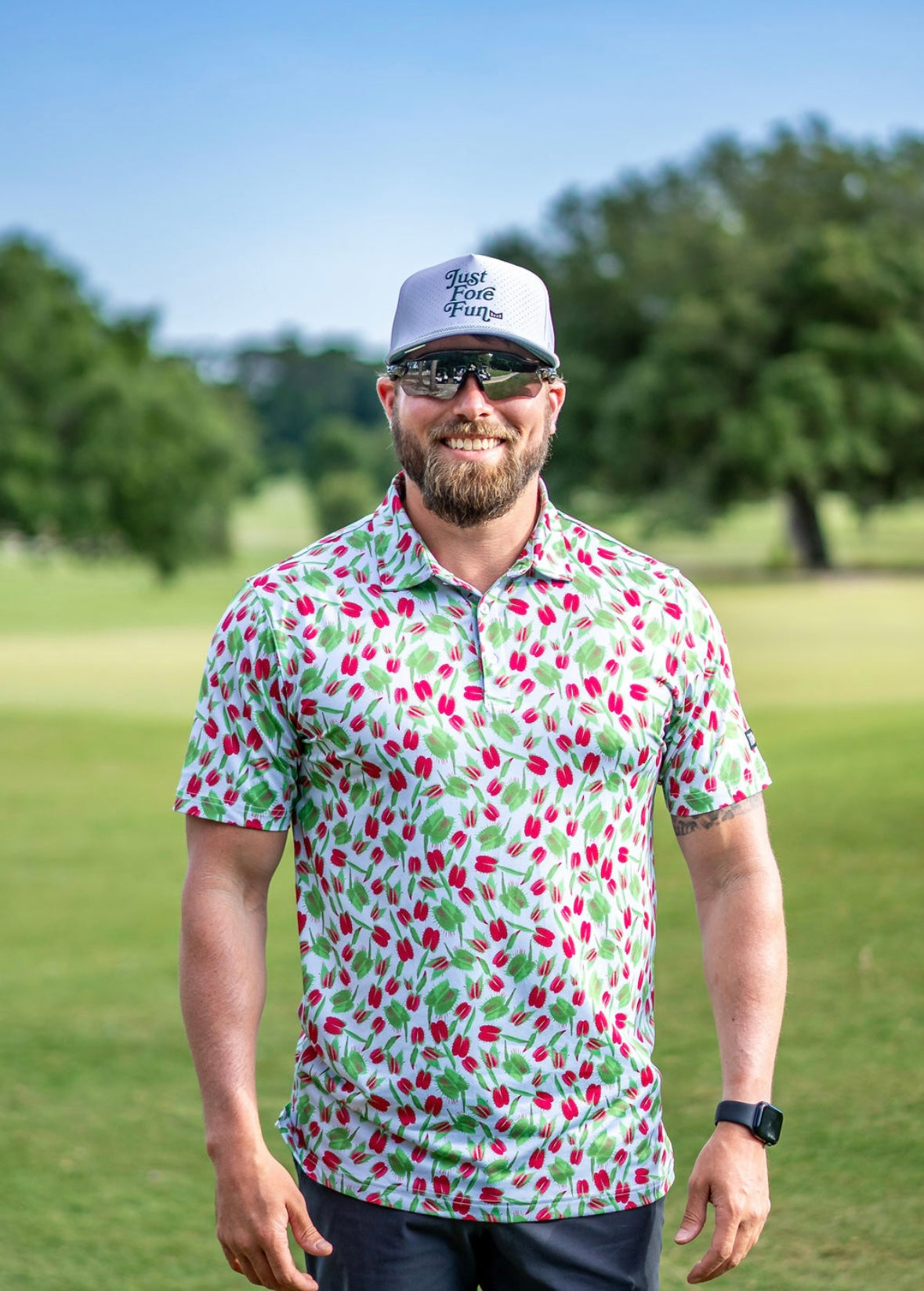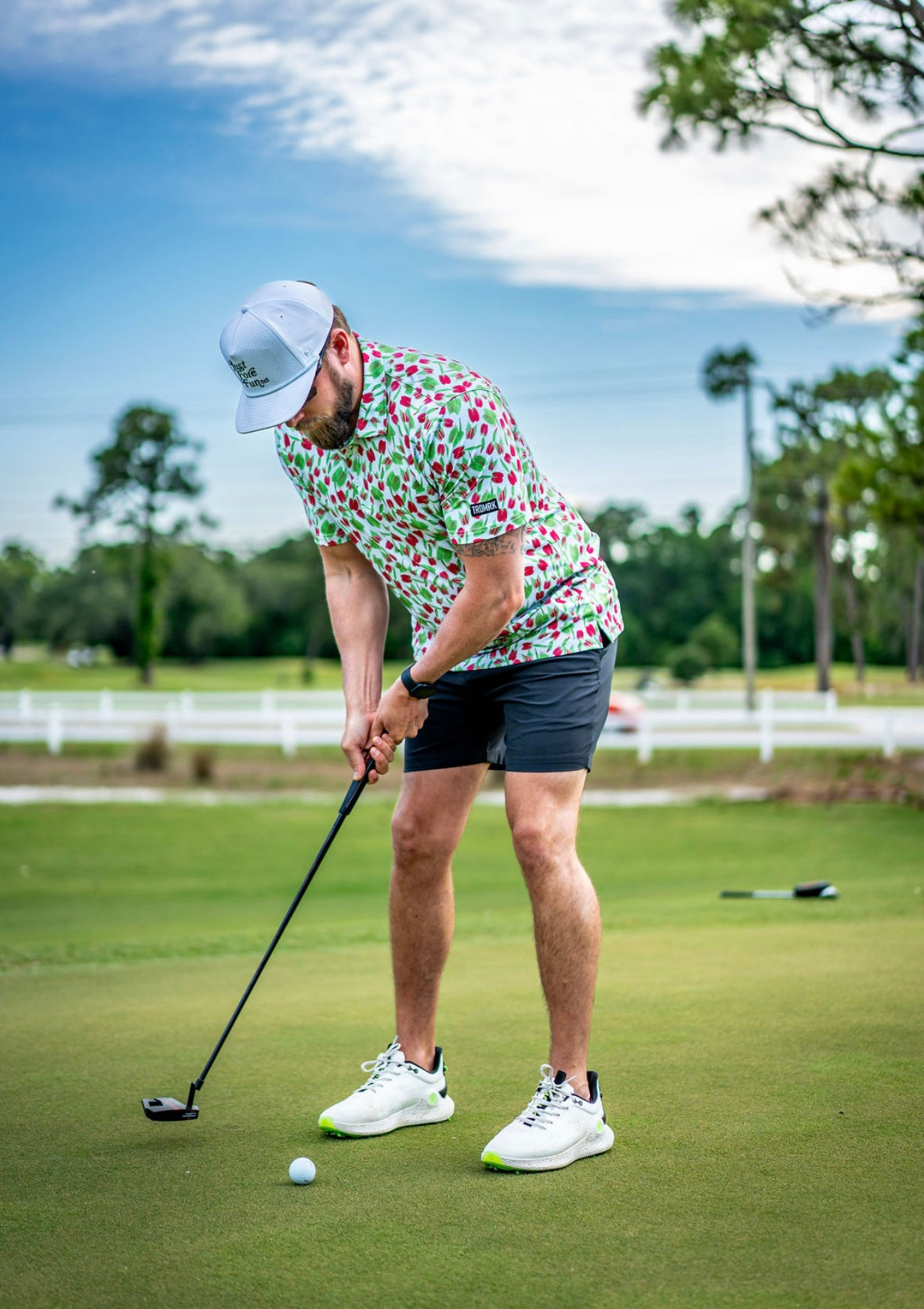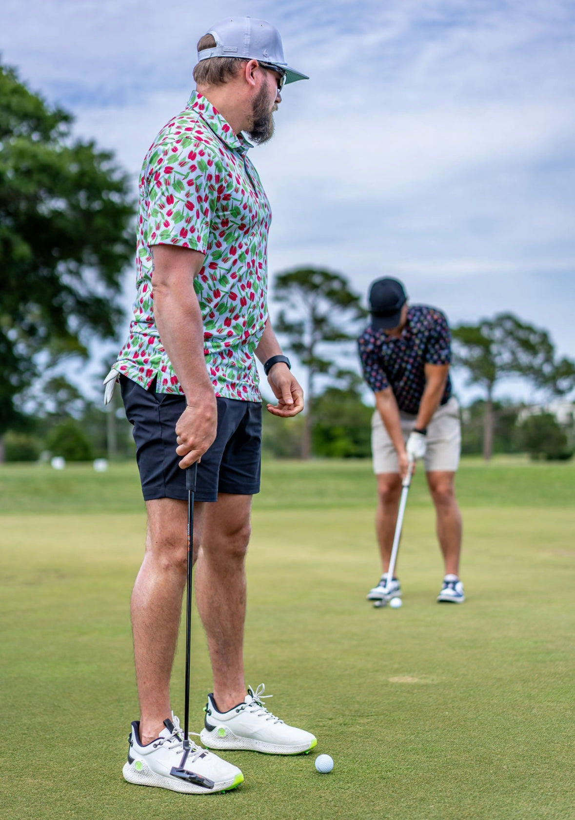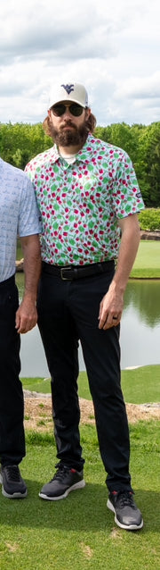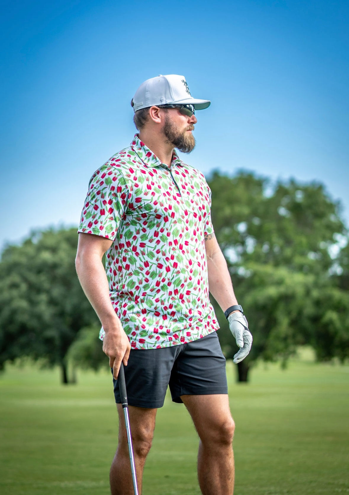 Premium men's golf polo. 92% polyester, 8% spandex mix. 4-way stretch. Moisture wicking. UV protection. Athletic fit.